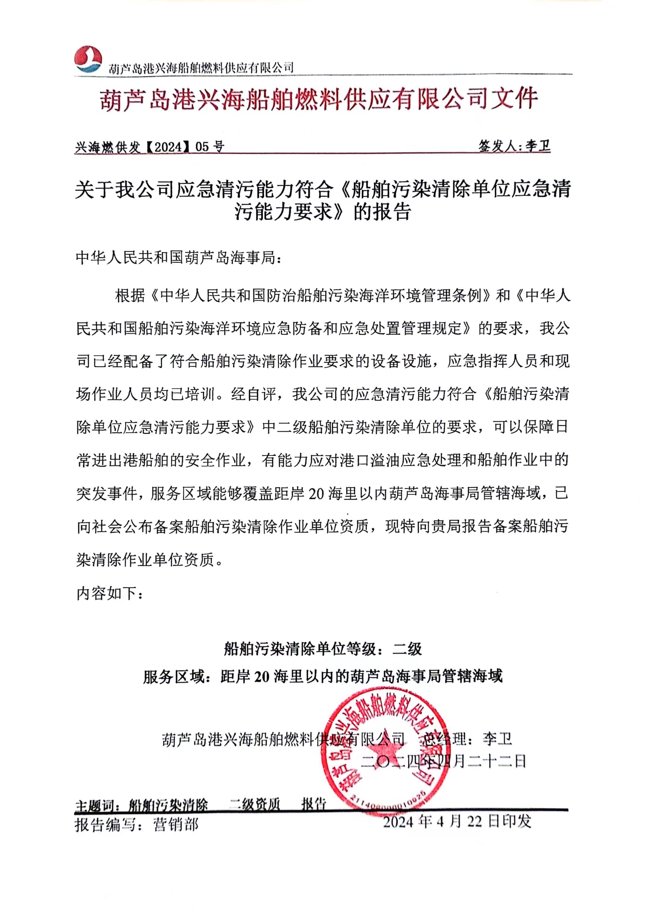 上一篇: 關(guān)于我公司應(yīng)急清污能力符合《船舶污染清除單位應(yīng)急清污能力要求》的報(bào)告